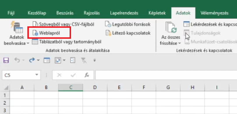 Az Adatok menü alatt találod a Power Query parancsokat, köztük a „Weblapról” ikont: